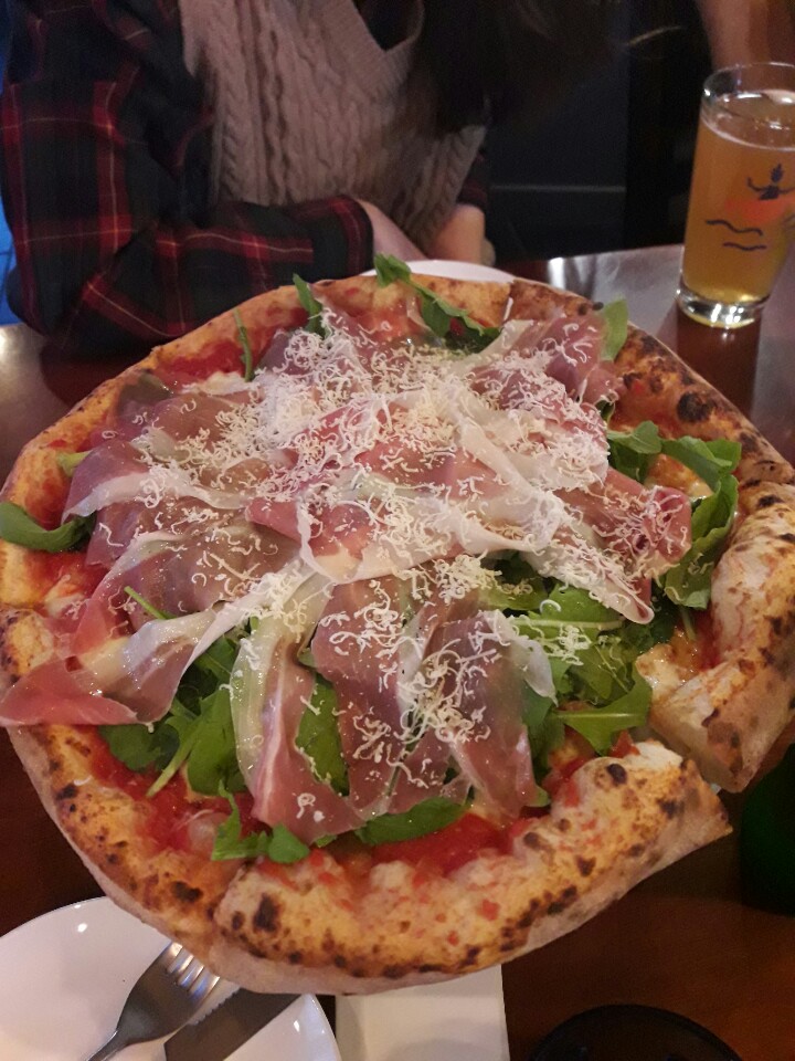 저희는 '루꼴라 에 프로슈토' 피자를 골랐어요. (27,000원) '프로슈토(prosciutto)'란 이탈리아어로 '햄'을 뜻하고, 구체적으론 전통방식으로 염장해 말린 얇~은 돼지고기입니다. 얇은 베이컨 모양을 떠올리면 되어요. 짠 맛의 햄과 함께 듬뿍 올린 루꼴라 조합이 맛있을 것 같아서 선택!