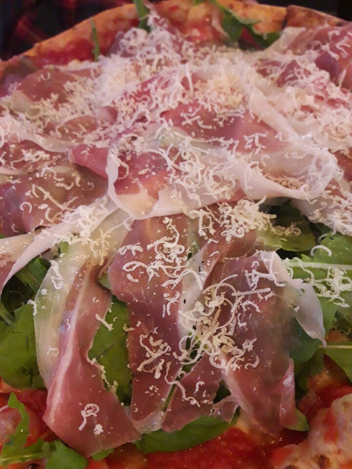 저희는 '루꼴라 에 프로슈토' 피자를 골랐어요. (27,000원) '프로슈토(prosciutto)'란 이탈리아어로 '햄'을 뜻하고, 구체적으론 전통방식으로 염장해 말린 얇~은 돼지고기입니다. 얇은 베이컨 모양을 떠올리면 되어요. 짠 맛의 햄과 함께 듬뿍 올린 루꼴라 조합이 맛있을 것 같아서 선택!