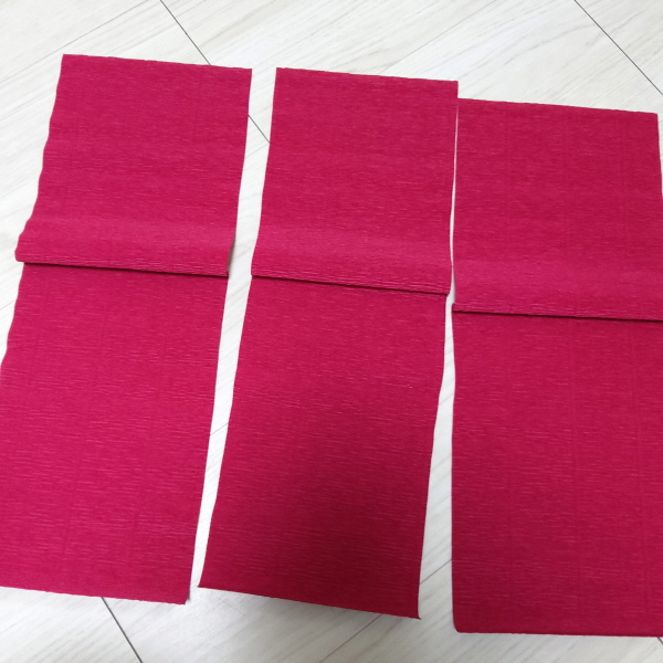 빨간색 주름지를 펼칩니다.(제가 사용한 주름지 크기를 가늠하시도록 가위를 올려놨어요.) 주름지를 자세히 보시면 대나무 마디처럼 마디가 나뉘어 있는데요, 그 마디와 평행하게 3등분을 해요.