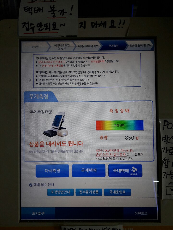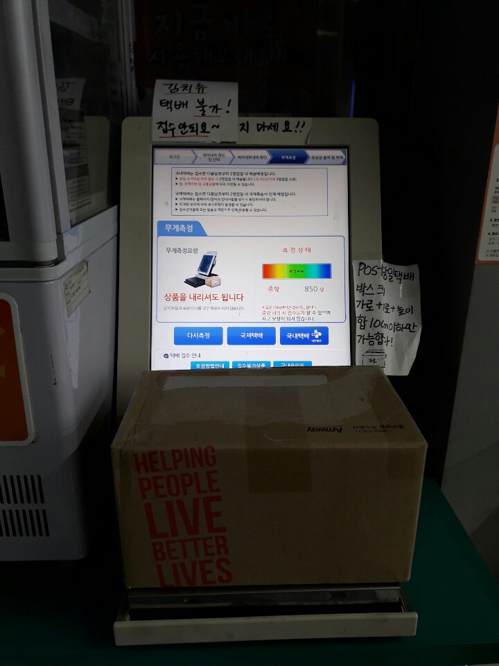 그 후 모니터 아래 전자저울에 택배를 올려 무게를 측정하게 되는데요. 무게에 따라 택배비 차이가 생기기 때문에 정확히 측정해야 합니다. 기사님 수거 시 실제 무게와 다르다고 판단되면 배송 거부될 수 있습니다.
