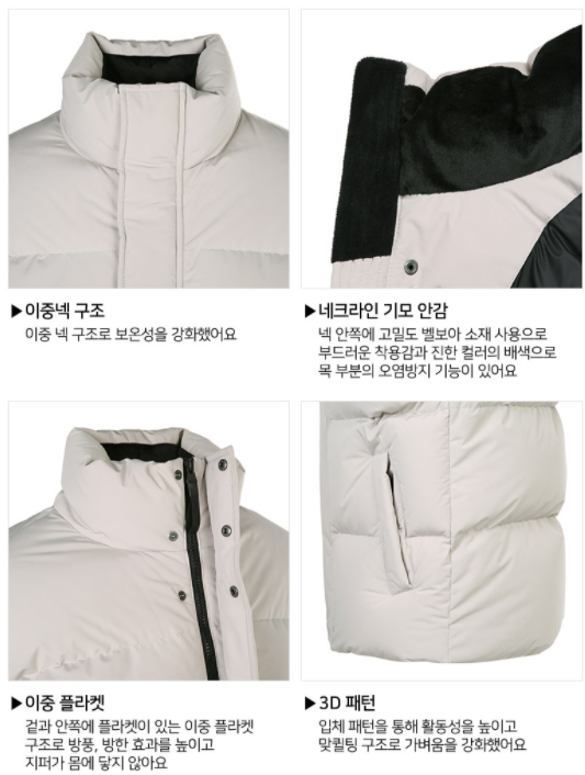 이 제품의 특징은 풍성한 볼륨감인데요, 솜털 80:깃털 20의 풍성한 충전재로 이런 불륨감이 가능한 것이라고해요. 또한 고 신축사 원단을 사용해서 보다 편안하게 착용가능하고, 소재 뒷면에 라미네이팅 코팅을해서 생활방수, 방풍, 털빠짐 방지 기능을 더해 항상 뽀송하게 즐길 수 있는 것이 특징이라고 하네요.