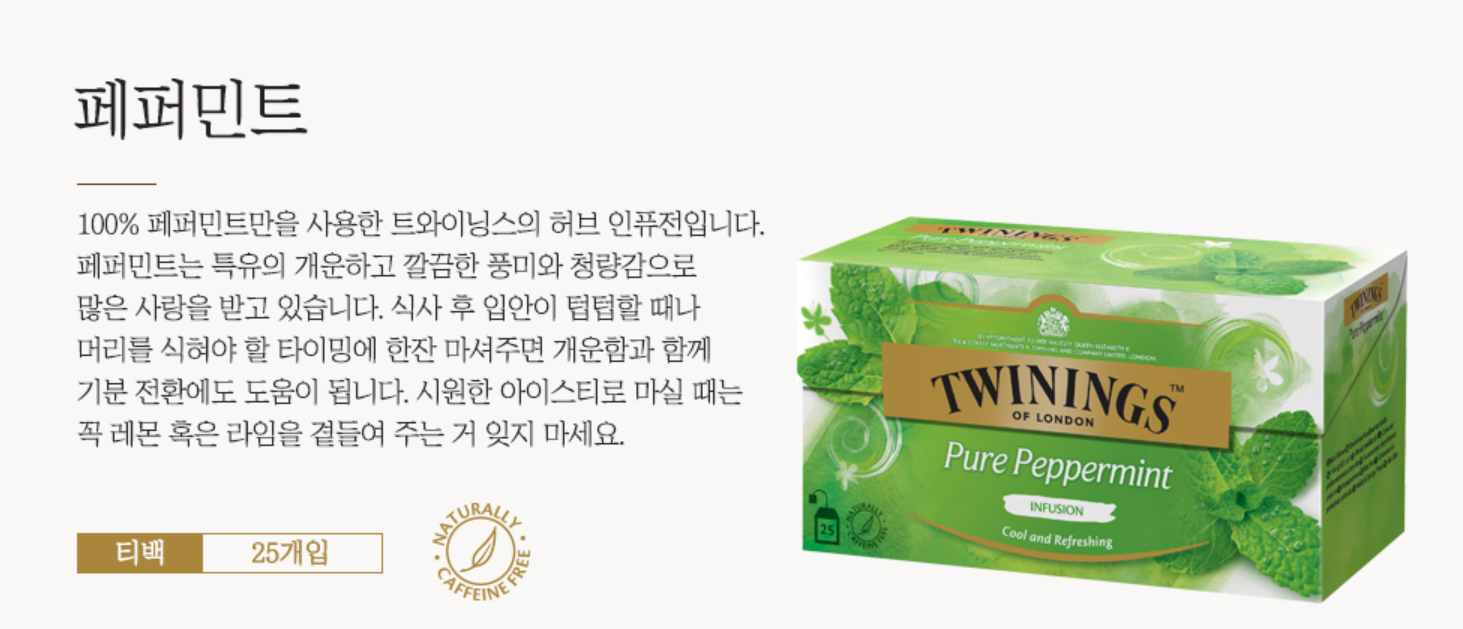 +그래서 카페인 걱정 없는 트와이닝 '허브차'도 있습니다! 트와이닝 루이보스/레몬티/스트로베리&망고 등이 있는데, 저는 개인적으로 오후 나른할 때 아래 트와이닝 페퍼민트 허브차 티백 효과를 톡톡히 보고 있습니다. 아주 개운해요! :)