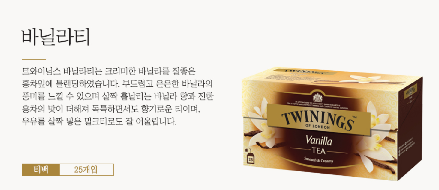 + 특이한(!) 트와이닝 홍차를 추천한다면, 저는 이번에 처음 알게된 바닐라티가 있는데요. 홍차에서 바닐라맛이 나요!(왕신기!!) 바닐라향을 좋아한다면, 밀크티로도 즐길 수 있어요. 트와이닝 바닐라티 티백 2개를 뜨거운물 한컵(200ml)에 4분 정도 진~하게 우려준 후, 각설탕 3개와 우유 100ml를 추가하면 됩니다.