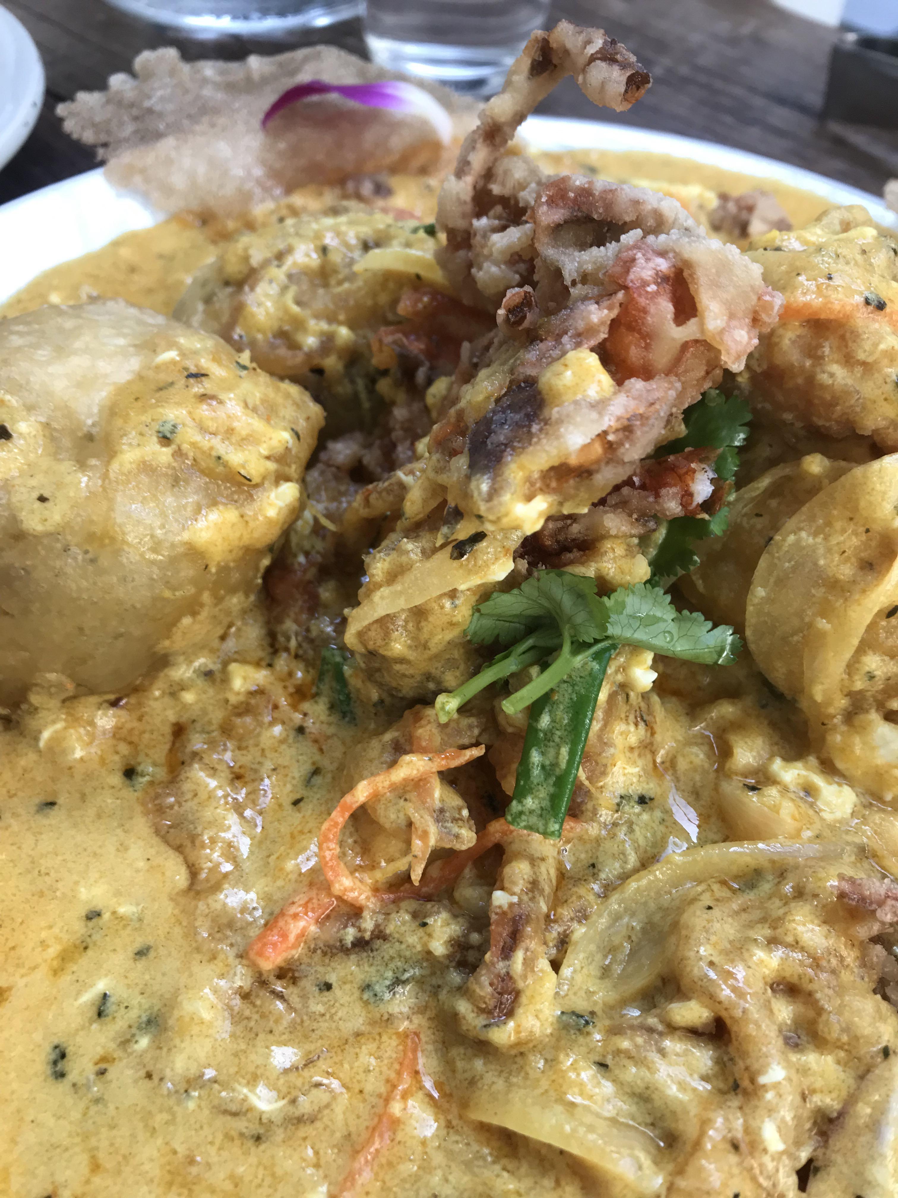 푸팟퐁커리에는 또 제가 좋아하는 가지튀김도 들어있어요. 동그란 튀김 덩어리 보이시죠? 이게 바로 가지인데, 잘라서 소스와 먹으니 정말 꿀맛이었어요. 맵고 자극적인거 잘 못 먹는 아이들도 맛있게 즐길 수 있는 메뉴인것 같아요.