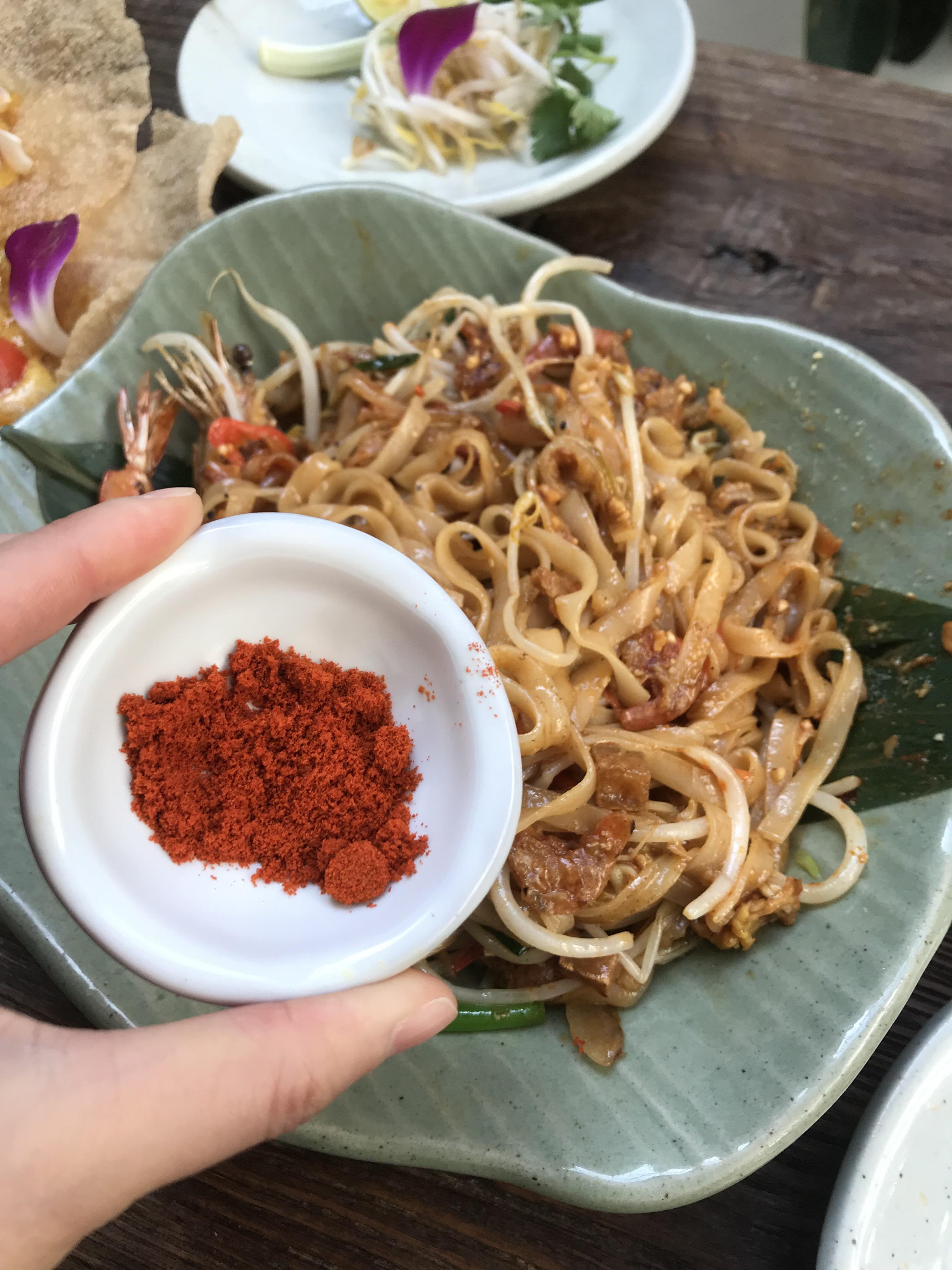 요건 팟타이에요. 저는 조금 매콤하게 먹고싶어서 고춧가루를 요청드렸고, 솔솔 뿌려 먹으니 감칠맛도 나고 적당히 매콤해 지더라구요. 팟타이안에는 큰 새우와 작은 건새우가 넉넉히 들어가서 씹는맛이 있었어요. 간도 딱이고, 양도 넉넉해서 정말 배부르게 순삭했답니다.