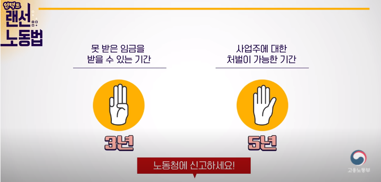 임금의 소멸시효는 3년으로 그 기간 안에 미지급받은 부분을 청구할 수 있으며, 이와 별개로 사업주에 대한 처벌은 5년까지 가능합니다.