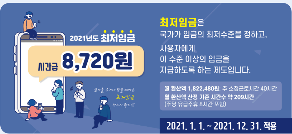 올해 2020년 시급은 8,590원인데요. 여기에 1.5% 인상되어 2021년 최저시급은 8,720원으로 확정되었습니다.