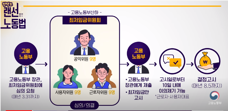 최저임금이 많이 오르면 사업주들에게 부담이 되고, 적게 오르면 근로자들이 어렵기 때문에, 많은 것이 고려되어 결정되는데요. 최저임금위원회의 심의/의결을 거쳐 매년 8월에 최종 결정되고 있습니다.