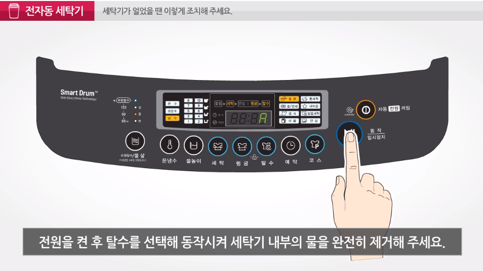 이후 다시 탈수 버튼을 눌러주면, 배수호스가 얼어서 빠지지 못했던 물이 속시원히 내려갑니다.