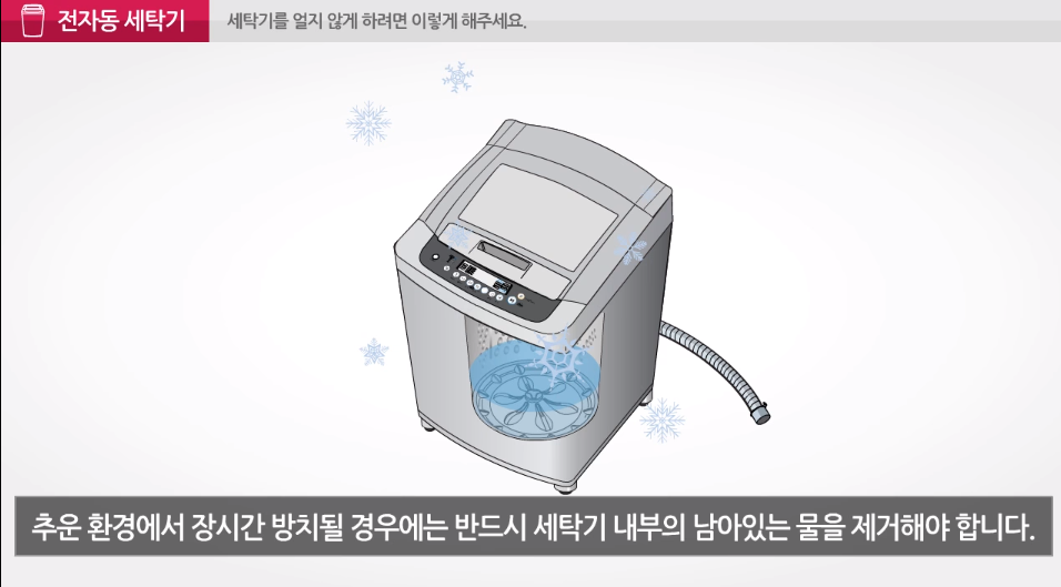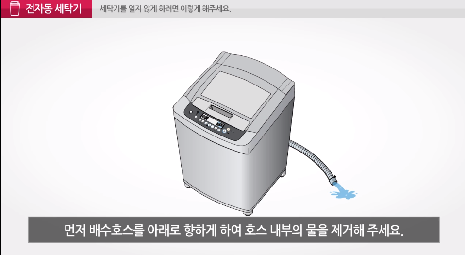 세탁기가 추운 곳에 위치하였다면, 겨울철 세탁기 내부/배수호스 안에 남아있는 물이 없도록 해야 합니다.