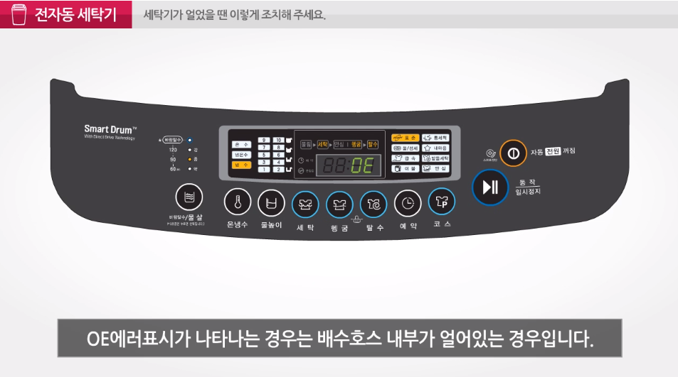 보통 세탁-헹굼-탈수 단계로 세탁기가 작동하는데, 가장 흔한 세탁기 동결 문제는 '배수호스'가 얼어 '탈수'단계에서 멈추고 작동하지 않는 것인데요. 세탁기 브랜드/기종에 따라 다르지만 FF/SE/OE 등 에러코드가 뜨면서 멈추게 됩니다.