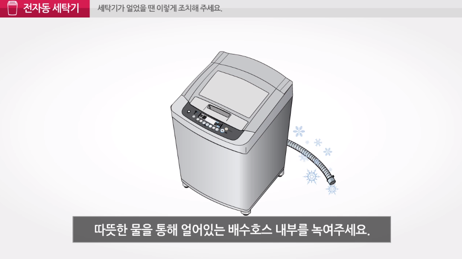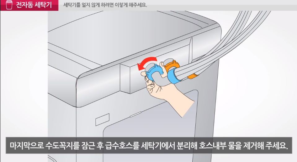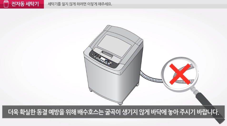 세탁기가 추운 곳에 위치하였다면, 겨울철 세탁기 내부/배수호스 안에 남아있는 물이 없도록 해야 합니다.