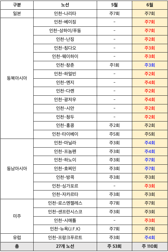 아래는 아시아나 5월, 6월 운항표입니다. 빨간색은 운항하지 못했던 노선을 운항하려는 계획이고, 파란색은 증편하는 노선들입니다.