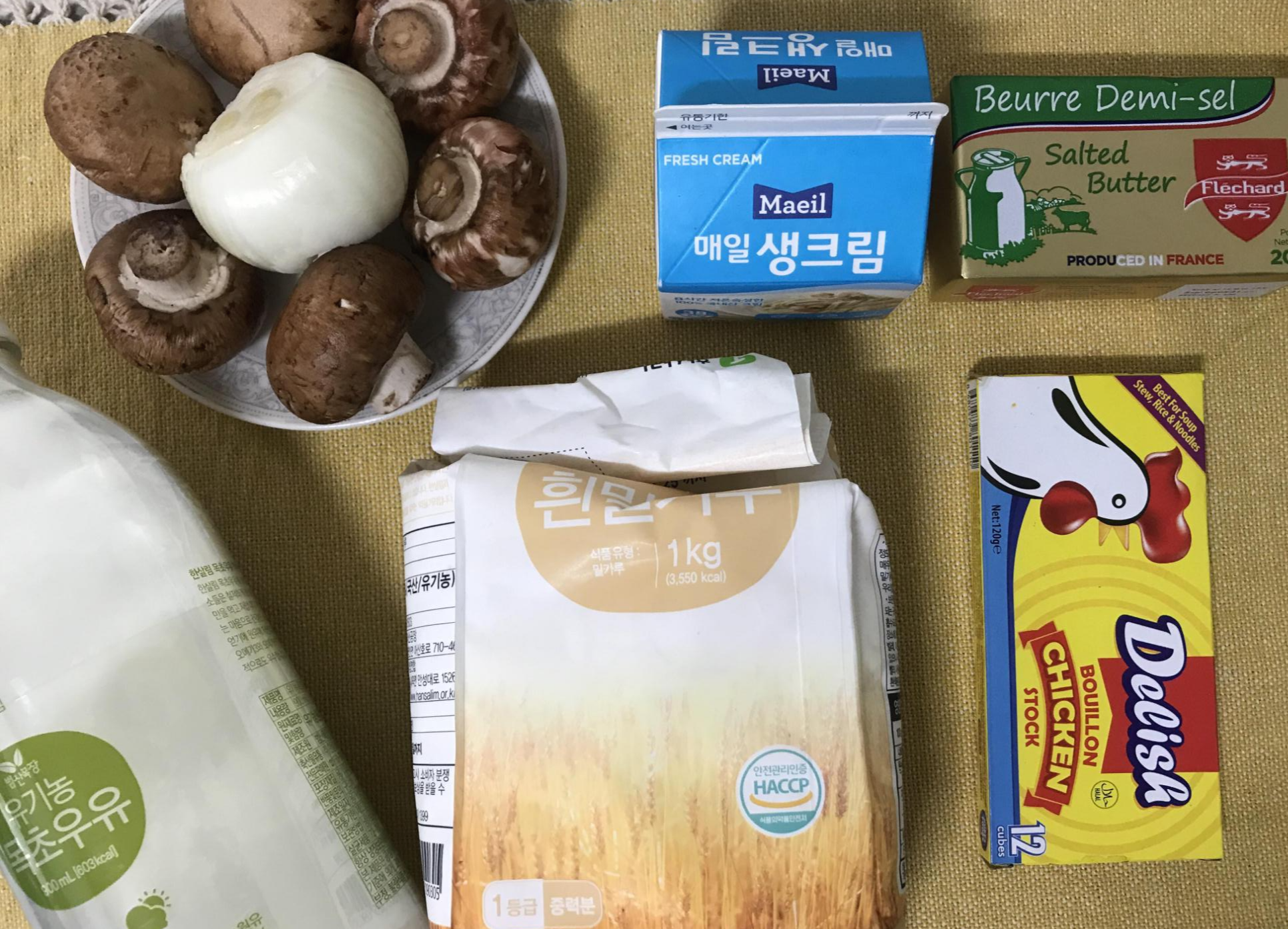"양송이 버섯, 양파, 버터(가염으로 준비해 주세요), 생크림 200ml, 우유 250ml, 치킨스톡, 밀가루"