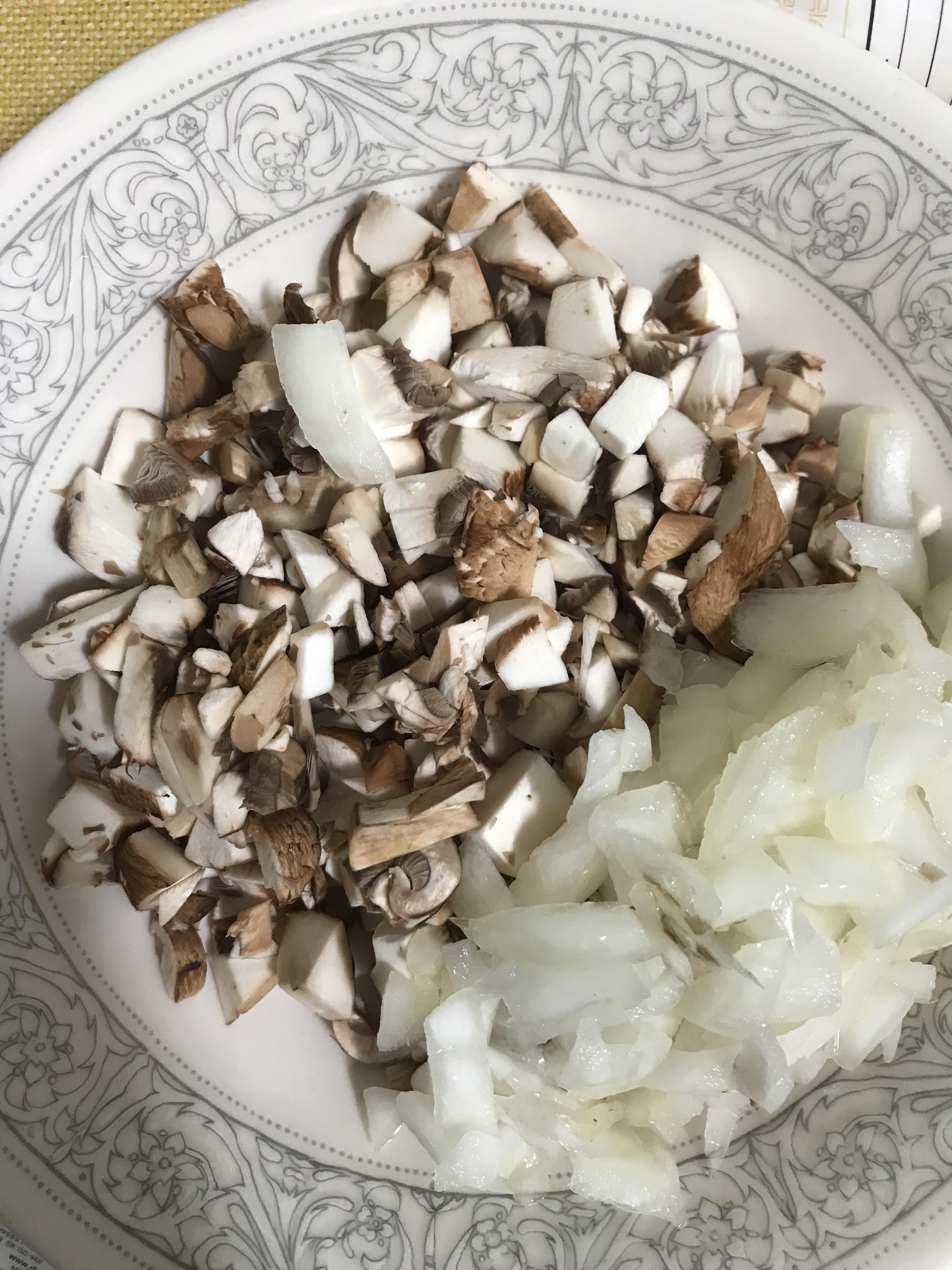 양송이 버섯과 양파를 잘게 다져 주세요. 너무 잘게 다지실 필요는 없구요, 나중에 살짝 볶다가 믹서에 갈 예정이라서 너무 크지 않게만 다져주시면 되요. 찹찹찹~~아래 크기 정도로만 준비해 주시면 됩니다.