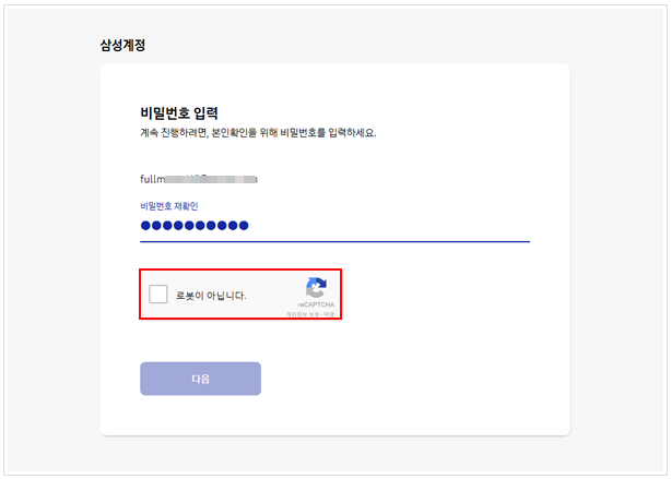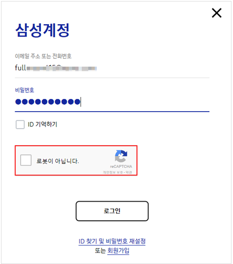 삼성 계정으로 findmymobile.samsung.com 접속 후, 아이디와 비밀번호를 입력합니다. 아래 사진처럼 로그인 보안을 위해, 위 사진처럼 '도로 표지판 이미지 클릭하기' 단계도 통과해야 하고요. 무사히 로그인만 되었다면, '잠금 해제'를 클릭하고, 다시 한번 비밀번호를 입력하면, 휴대전화의 잠금이 원격으로 해제됩니다.