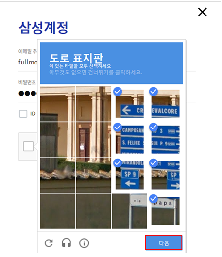 삼성 계정으로 findmymobile.samsung.com 접속 후, 아이디와 비밀번호를 입력합니다. 아래 사진처럼 로그인 보안을 위해, 위 사진처럼 '도로 표지판 이미지 클릭하기' 단계도 통과해야 하고요. 무사히 로그인만 되었다면, '잠금 해제'를 클릭하고, 다시 한번 비밀번호를 입력하면, 휴대전화의 잠금이 원격으로 해제됩니다.