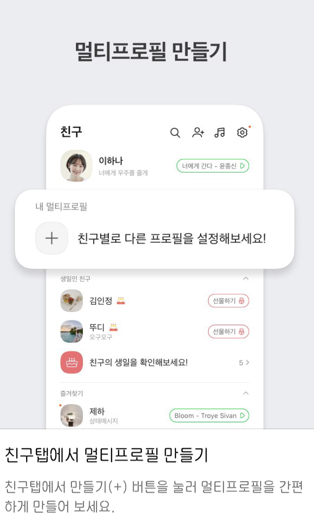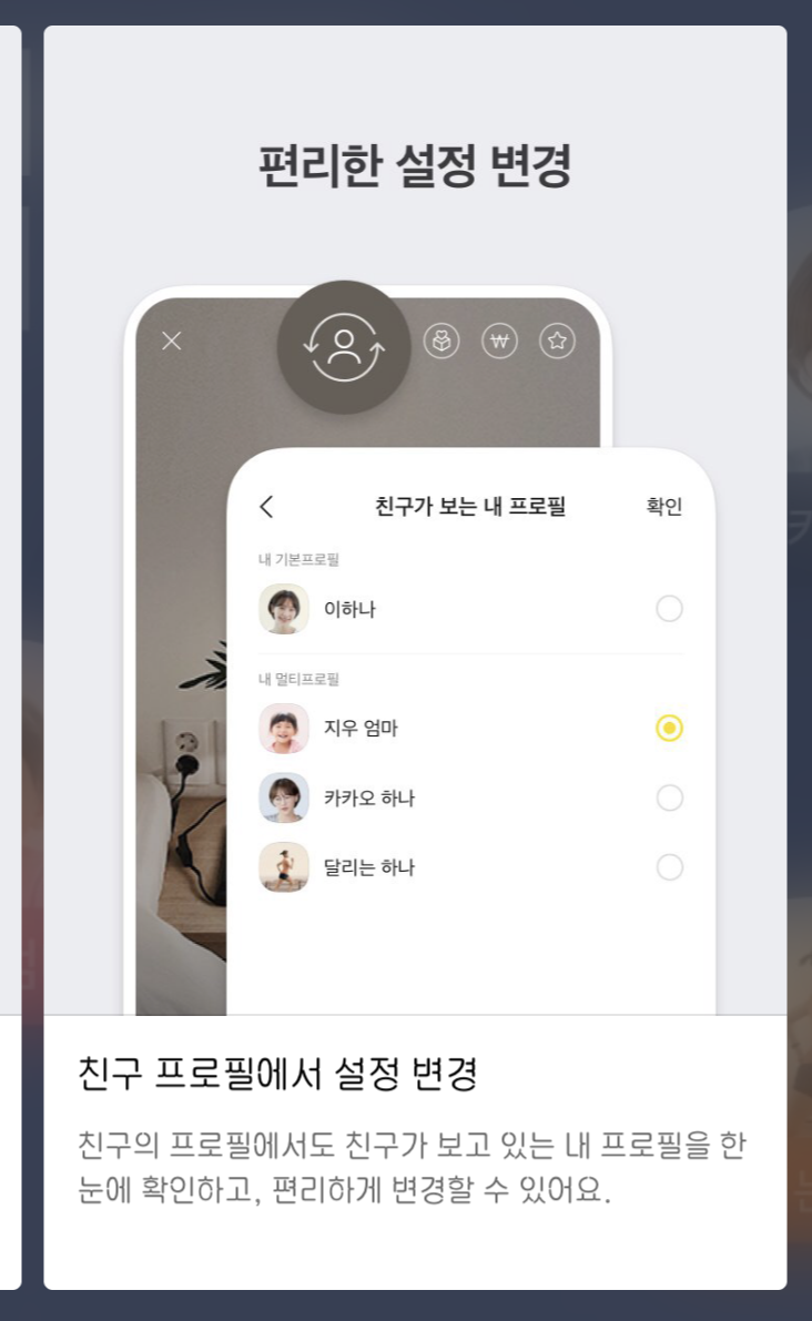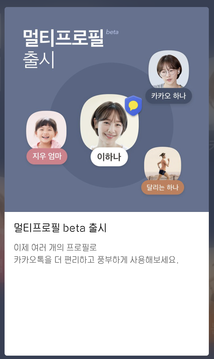 멀티프로필은 말 그대로 나의 프로필을 여러개 만들 수 있는 기능이에요. 그리고 만들어 놓은 나의 프로필에 친구로 추가(=설정)한 사람에게만 내 프로필이 노출되는 기능이랍니다. 친구로 추가되지 않은 사람에게는 기본 프로필만 보이게 되는 거구요. 간단히 말해서, 내가 설정한 프로필을 노출하고 싶은 사람에게만 보여질 수 있도록 하는 기능이에요. 최대 3개의 프로필까지 등록 가능 하답니다.