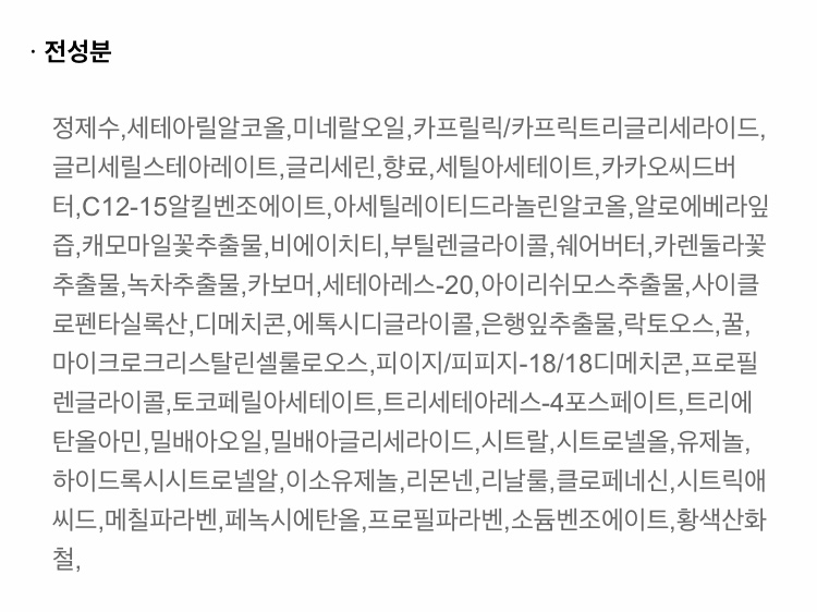 피부가 예민하신 분들은 아래 전성분표를 먼저 확인해 주시구요~패키지의 성분표시가 너무 작아 홈페이지 내용을 캡처했답니다.