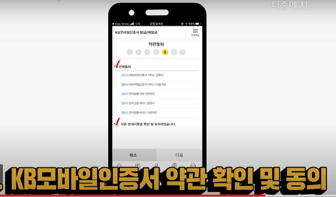 4. 국민은행 계좌인증을 하고 (계좌번호와 계좌비밀번호 입력), KB모바일인증서 발급을 위한 약관 확인 및 동의를 체크합니다.