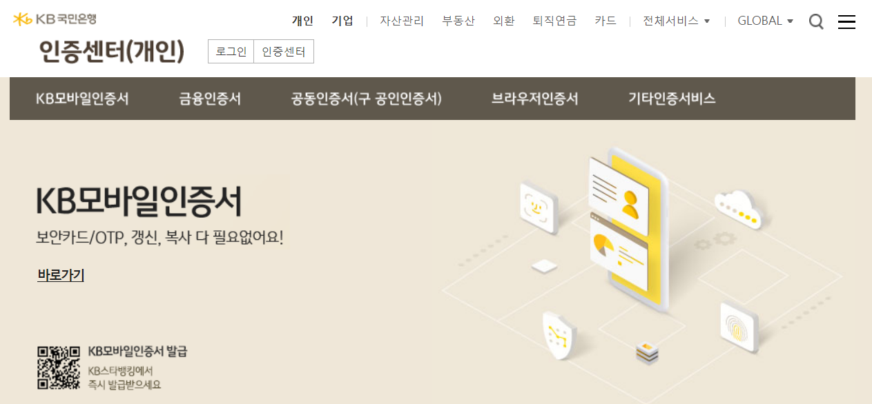 "KB모바일인증서 - 보안카드/OTP, 갱신, 복사 다 필요없어요!" 라는 문구가 매우 마음에 드네요! :)
