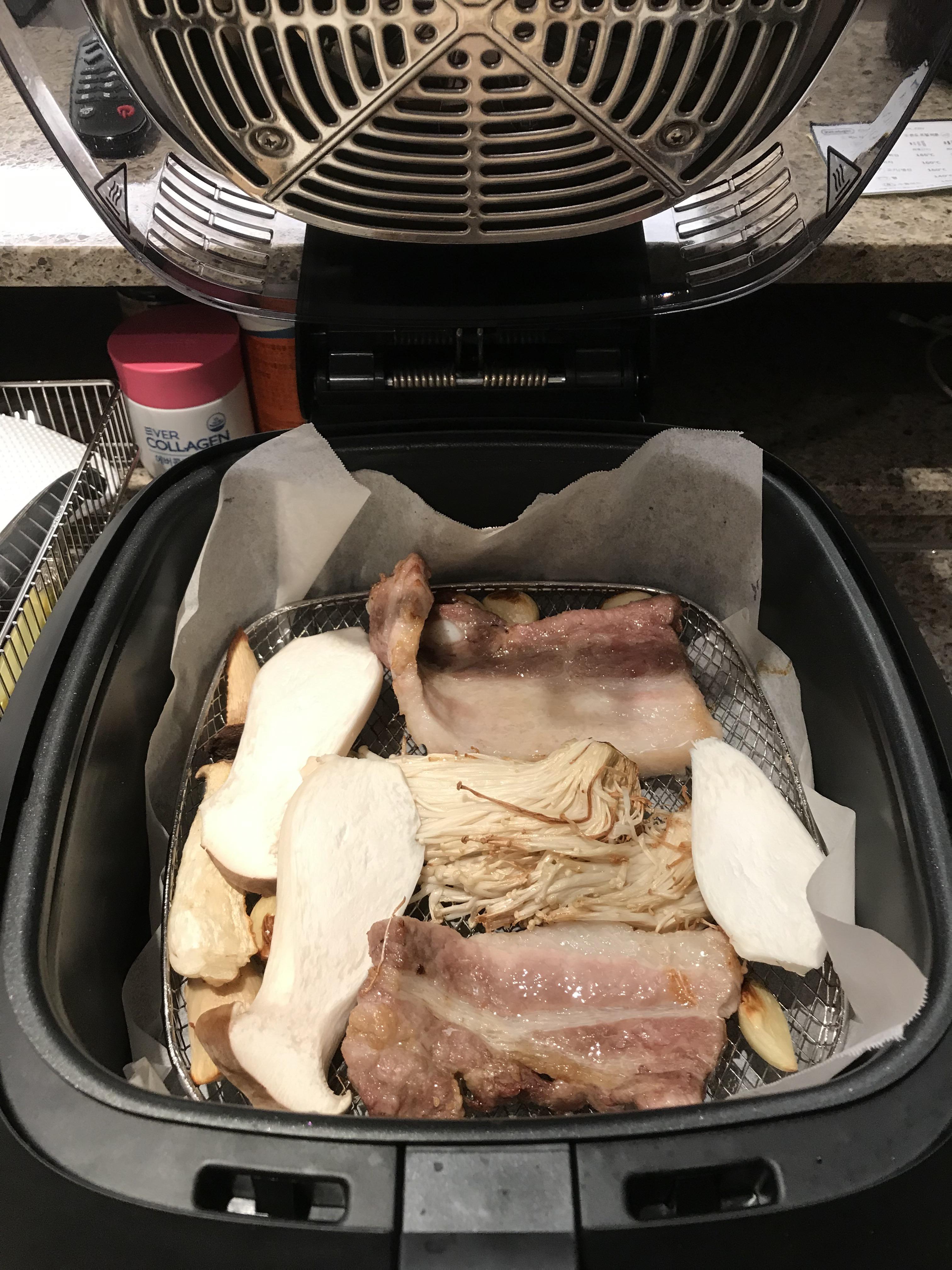 정말 해보고 싶었던 통 삼겹은 잠시 다음으로 미뤄두고...냉장고에 얇은 삼겹살이 있길래 버섯과 함께 구워보았어요. 삼겹살은 기름이 많이 생기기 때문에 에어프라이어 안쪽에 유산지를 깔고 조리해주었답니다. 조리가 더 편리하도록 몇가지 조리 모드가 있어서 '고기' 모드를 선택 후 약 25분정도 구워 주었답니다. 고기와 버섯을 너무 빽뺵하게 넣어주어서 그런지 고기 뒷면이 잘 익지 않아 한번 열어 뒤집어 주고 더 구워주었어요. 확실히 불판에 굽는 것 보다 촉촉하게 완성되었네요. (완성된 사진은 먹는데 집중하느라 깜빡...ㅎㅎㅎ)