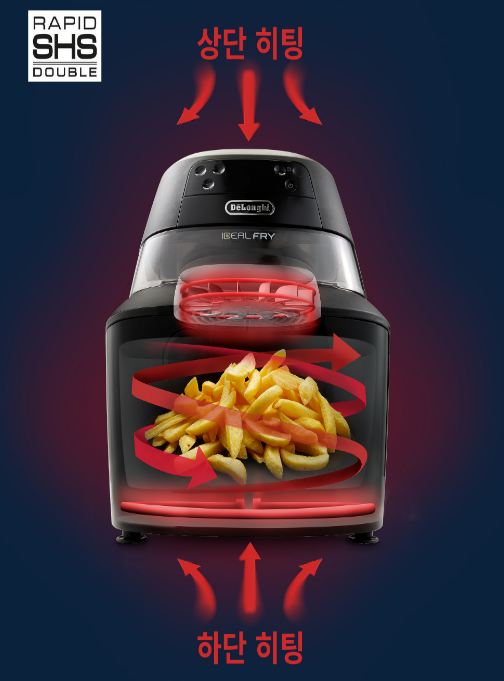 드롱기 에어프라이어를 선택한 두가지 이유가 있는데요, 첫번째로 더블히팅 시스템 때문이었어요. 한쪽에서만 열이 방출되는 방식이 일반적인 에어프라이어라면 드롱기 제품은 상단과 하단 양쪽에서 열이 방출될 수 있도록 하는 더블히팅시스템이 적용되었답니다.