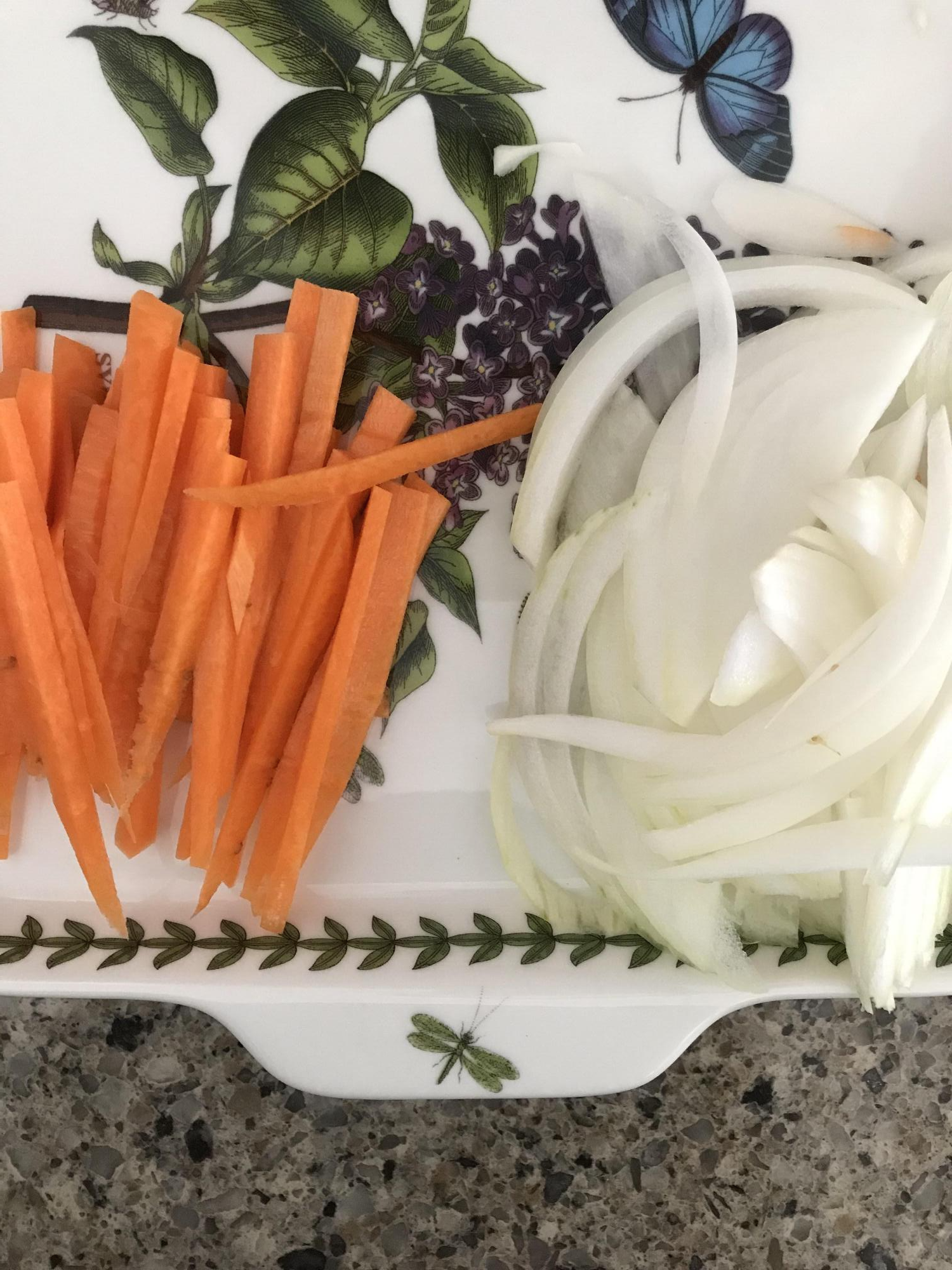 미역은 염분제거 후 꽉 짜서 준비해 주시고 이제 미역과 함께 볶을 양파, 당근을 채 썰어 준비해 주세요. 취향대로 양은 조절하시면 됩니다. 적당한 단맛을 내고 짠맛을 중화시키기 위해 양파를 많이 넣어 요리하는 것을 추천 드려요.