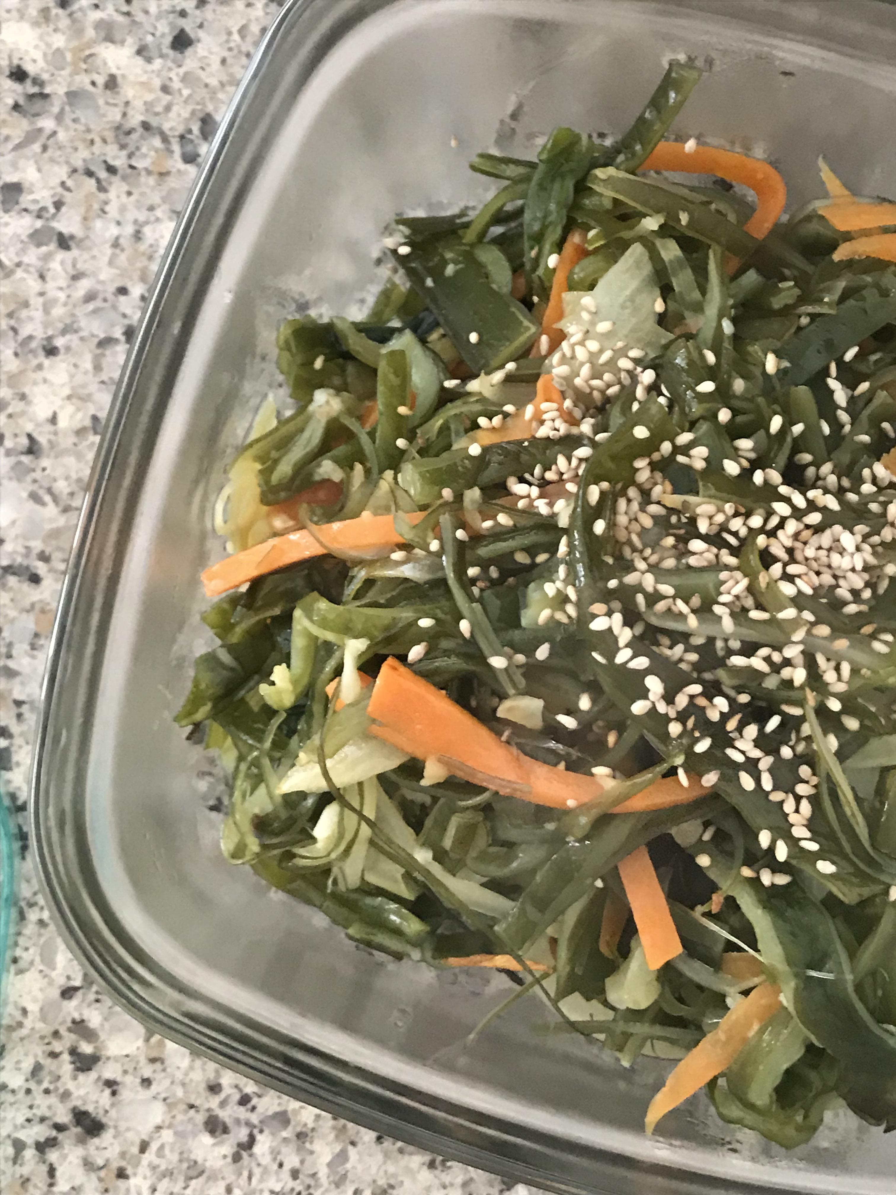 야채가 어느정도 익었다면 들기름을 조금 더 추가하고 미역을 함께 볶아주세요. 미역 자체가 짭짤하기 때문에 따로 간을 안해도 되지만 감칠맛을 위해 올리고당 약간과(양파를 많이 넣으셨다면 생략 가능), 맛술을 조금 넣어 주었답니다.