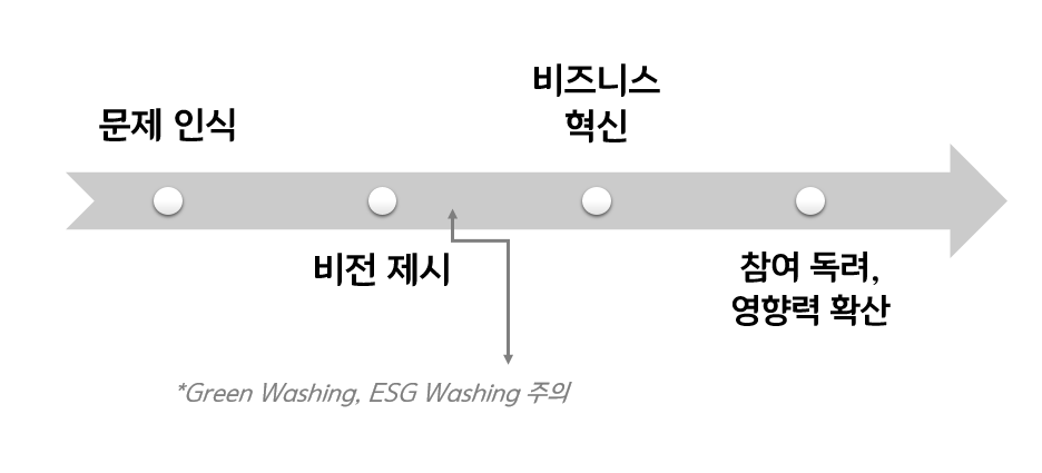 ESG 관련 여러 자료를 찾아보면서, '행동주의 기업'이라는 책도 읽게 되었는데요. 위 그림처럼, ESG를 수행하는 기업의 모범적(?) 흐름이 '문제인식 → 비전제시 → 비즈니스 혁신 → 참여독려, 영향력 확산'이라고 한다면요. 여기서 '실천'단계까지 가지 못하고, 겉만 번지르르하게 '비전제시'만 하고 끝나는 기업의 경우, 그게 바로 이미지세탁.. Green Washing/ESG Washing이 될 수 있다고 짚어주고 있습니다.