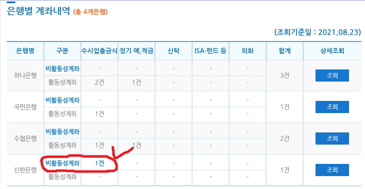 저도 서둘러 계좌통합조회를 해보니, 전 (은행 기준) 비활성계좌를 1건 발견할 수 있었습니다!!☆☆☆ 오호라!