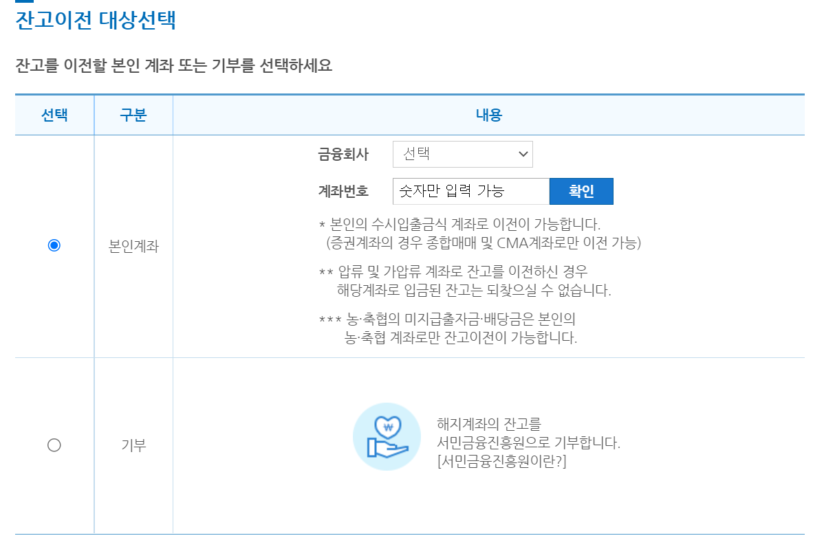 - 세금, 타행이체 수수료 등이 차감된 해지예상금액이 0원 이하일 경우 요청하신 계좌로 잔고이전이 불가능합니다. 이 경우 잔고를 이전할 계좌를 변경하거나 기부하실 수 있습니다. 이체수수료와 관련된 세부사항은 해지계좌소유 금융기관에 문의하시기 바랍니다.