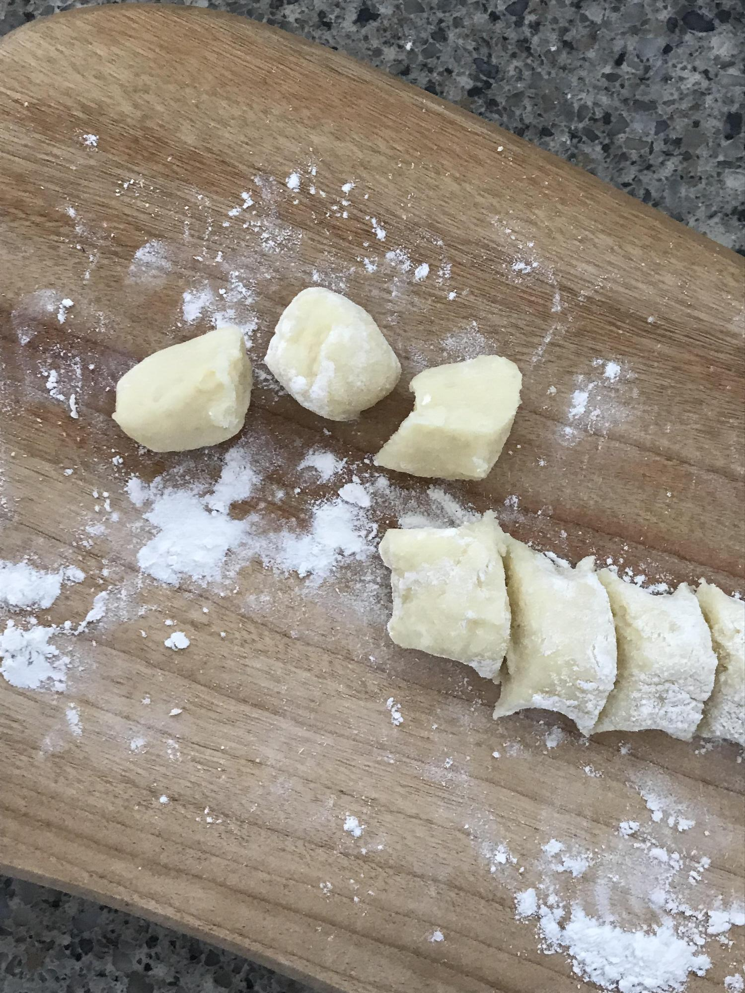 3) 이제 반죽 된 뇨끼를 먹기 좋은 크기로 잘라줍니다. 반죽 한 덩어리를 떼어 아래와 같이 돌돌길게 모양을 잡아준 다음 적당한 크기로 잘라주시면 되요. 반죽이 손에 달라붙을 수 있으니, 밀가루를 솔솔 뿌려주며 작업하시면 되요.