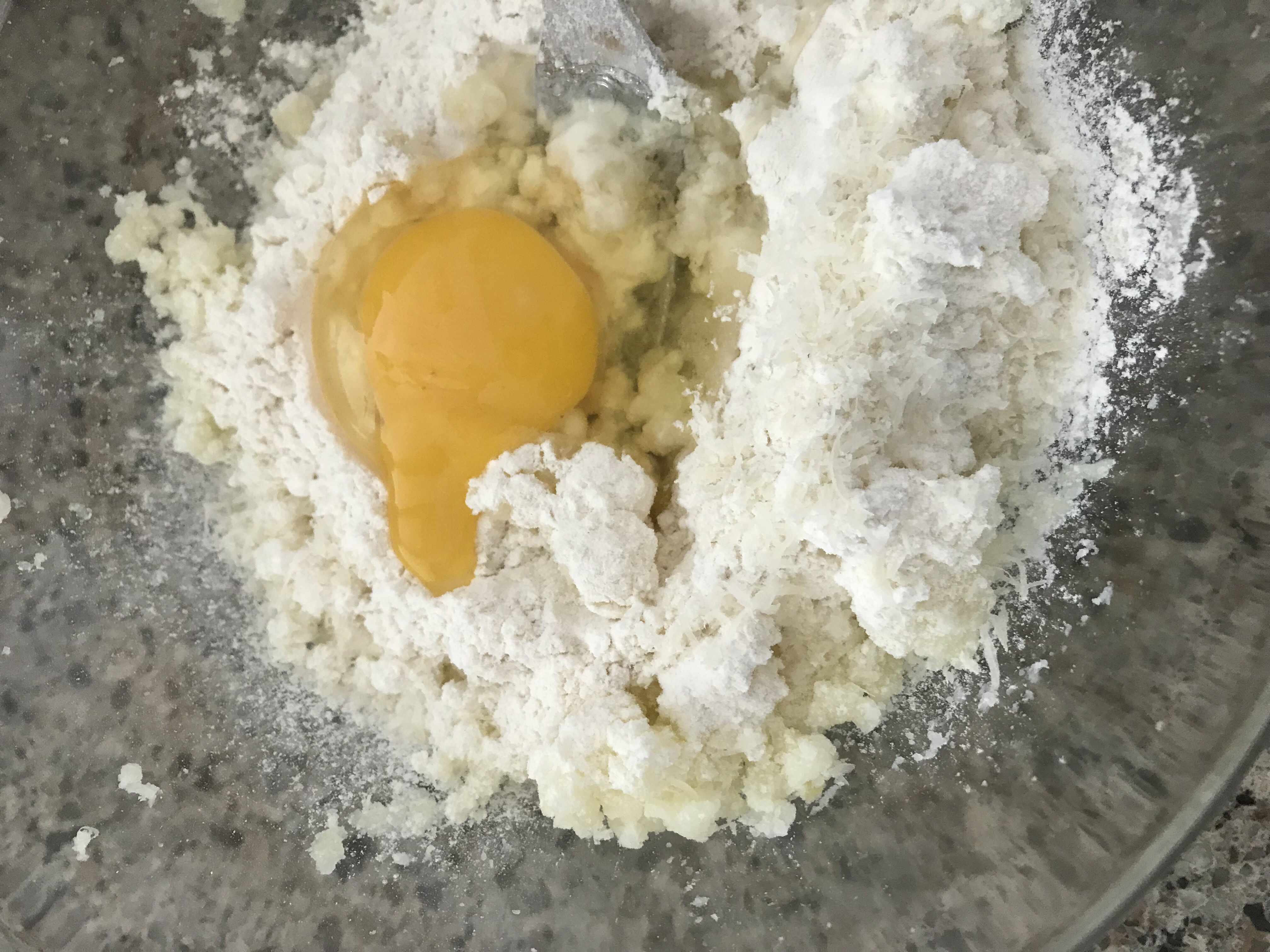 2) 감자를 모두 으깨주셨다면, 그 위에 고운채에 받쳐 밀가루를 넣어주세요. 채에 받쳐 넣는 이유는 나중에 밀가루끼리 덩어리지는 것을 방지하기 위함이에요. 그리고 계란 한알과 파마산 치즈를 솔솔 뿌려 잘 반죽해주세요. 저는 치즈를 넣어 따로 간을 하지는 않았지만 나중엔 좀 싱겁더라구요. 이 과정에서 꼭 소금으로 간을 맞춰주시는 거 잊지 마세요!^^