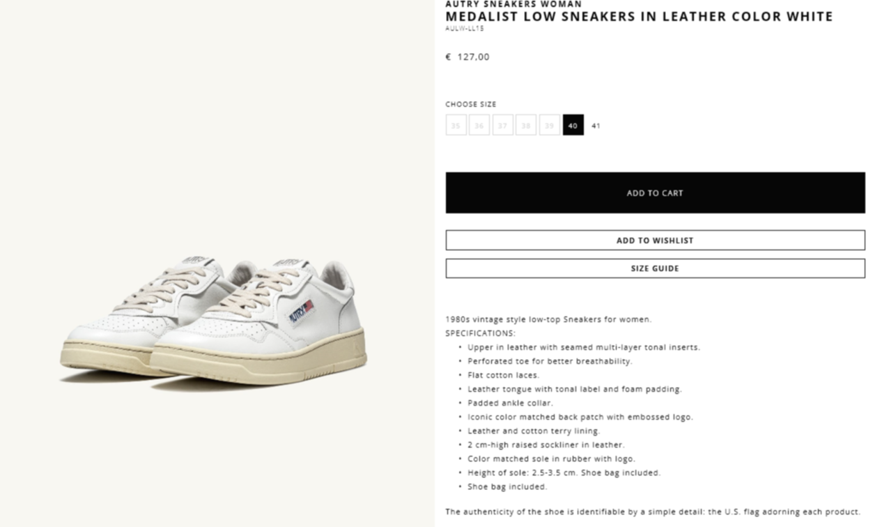 저는 오트리 입문자니까 가장 기본적인 화이트컬러를 구입하기로 하고 공식 홈페이지를 여러번 방문했었는데요, 역시나 제가 찾는 사이즈는 항상 품절이더라구요. 가끔 재입고가 되기도 한다는데, 현재도 39 아래로는 품절이고 큰 사이즈만 구입 가능한 상태네요.