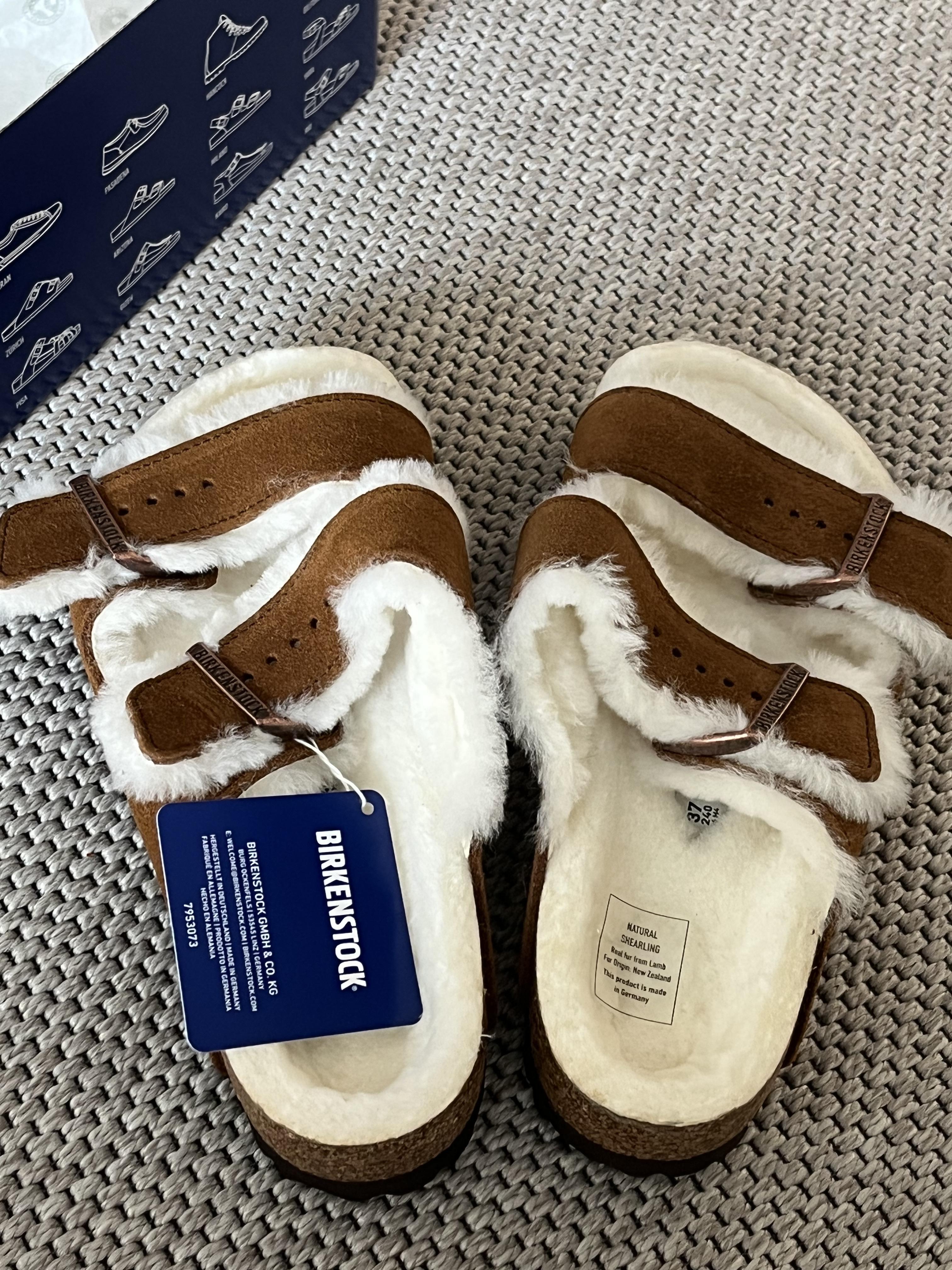 저는 37사이즈를 구매했는데요, 평소 버켄스탁 제품은 아주 딱 맞게 36 사이즈를 신었었어요. 그런데 이번 제품은 폭신한 양털이 깔려있어 약간 넉넉하게 신으면 더 편할듯 하여 한치수 업했어요. 도톰한 울삭스에도 신고 싶어 딱 맞는 것 보다는 넉넉한 게 나을 것 같았죠.