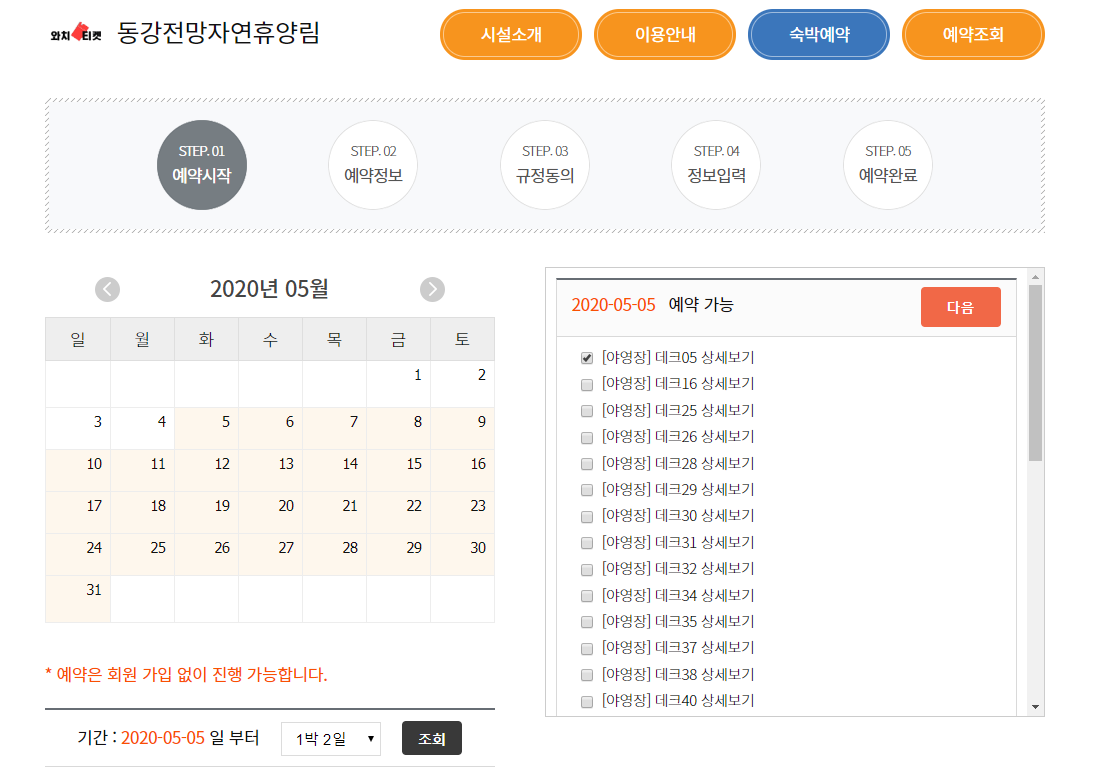 제가 금일(5월 4일) 현재 예약 가능한 데크를 확인해 보니 5월 주말의 경우 모든자리가 마감되었고