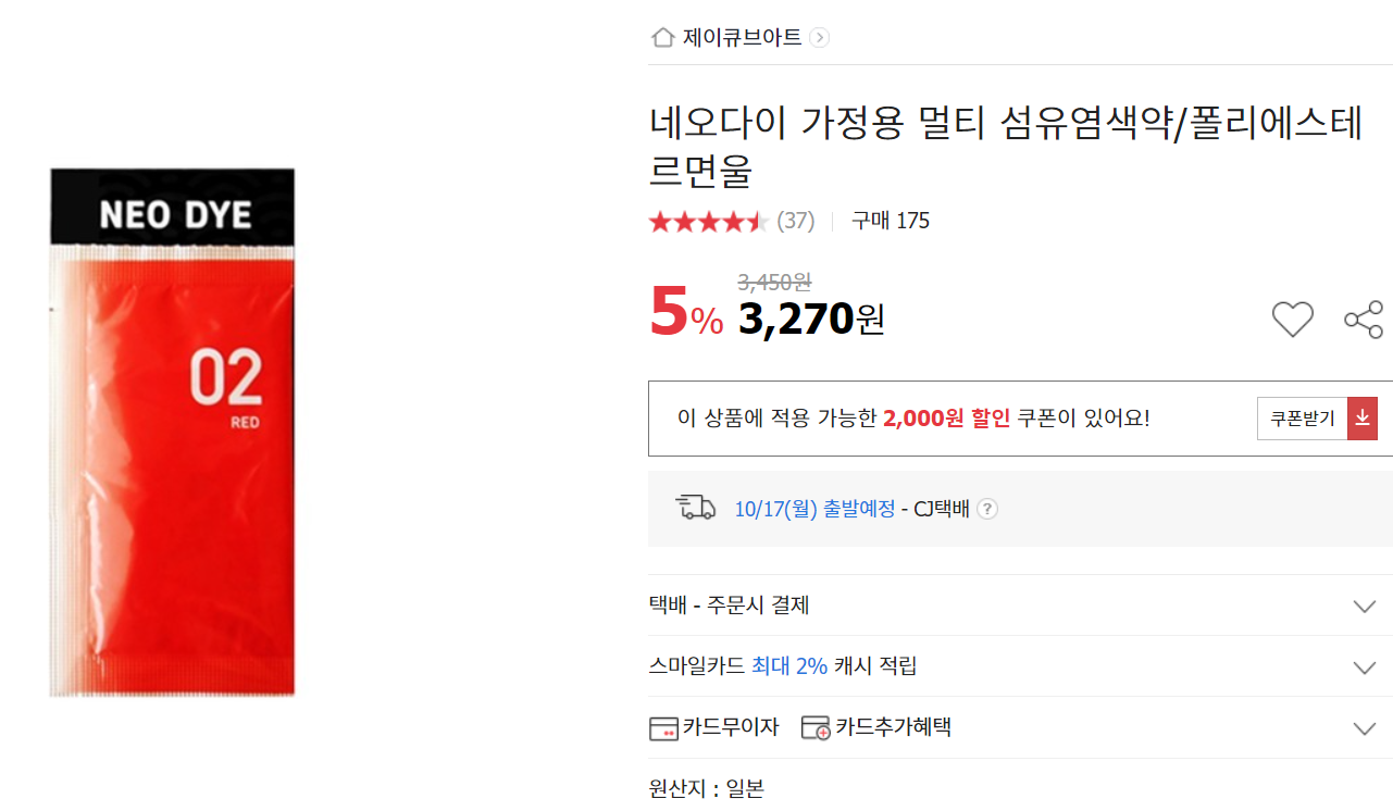가장 대중적인 옷 염색약/섬유 염색약은 '다이론'이라는 염료같더라고요. 하지만 주로 면소재를 대상으로 하는 염색약이라, 폴리에스터 100%에 빛나는 제 옷에는 적합하지 않았습니다. 그래서 다시 폴리에스터도 가능한 염색약을 폭풍검색으로 찾아보았습니다. 합성섬유용 염색제라는 '네오다이'!