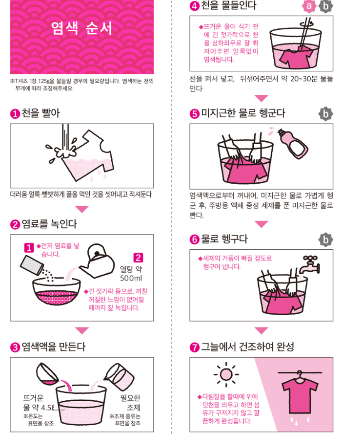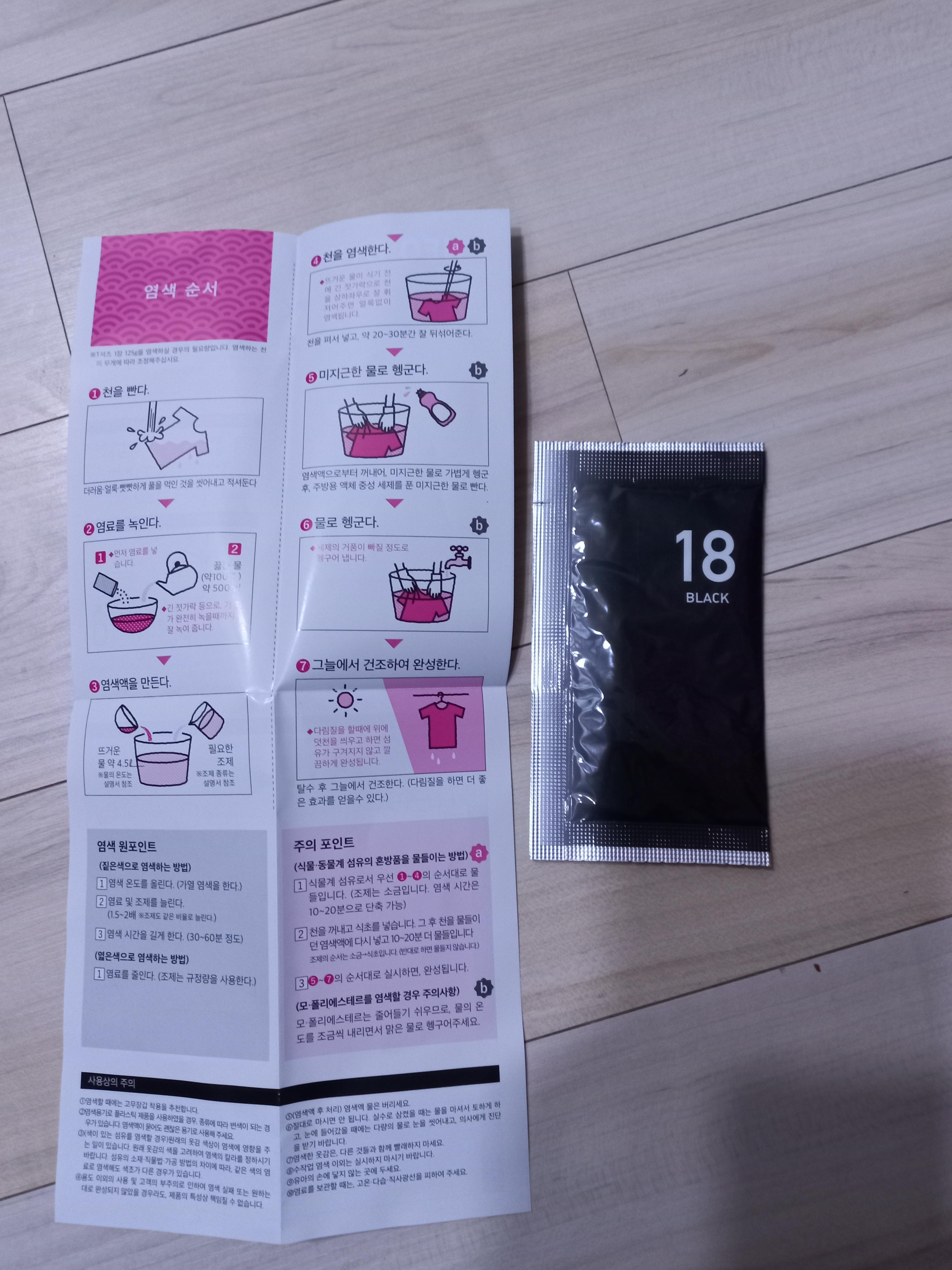 과정은 간단합니다. 염색제 가루를 탈탈 털어 뜨거운 물에 풀어 녹여주고, 염색할 옷을 담가놓고 조물조물!