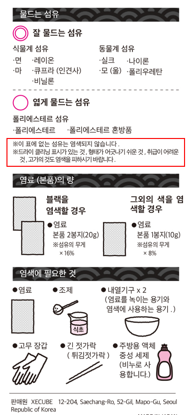 아무리 합성섬유용 염색제라고 하더라도, 역시 폴리에스테르의 한계가 있는지, 설명서엔 '엷게 물드는 섬유'로 분류되어 표시되어 있더라고요. 그리고 "드라이 클리닝 표시가 있는 것, 형태가 어긋나기 쉬운 것, 취급이 어려운 것, 고가의 것은 염색을 피하시기 바랍니다"라고 안내되어 있는데요. 제가 염색하려고 하는건 오래된 낡은 옷이라 부담없이 염색놀이(!)를 해보기로 했습니다.😄 망하면 염색공방체험 한 셈 치자! (정신승리를 잘하는 편)