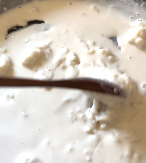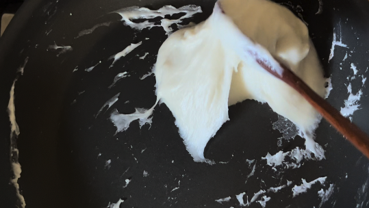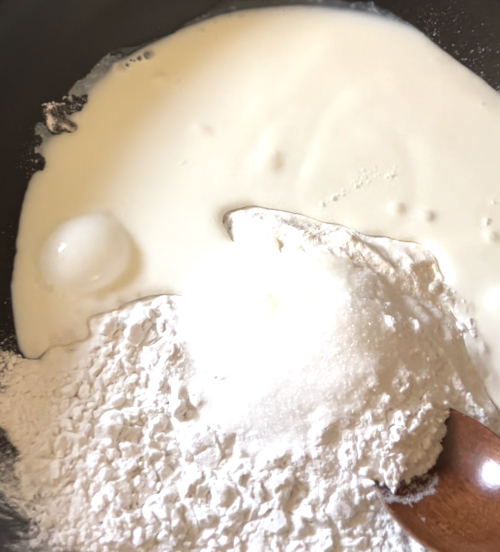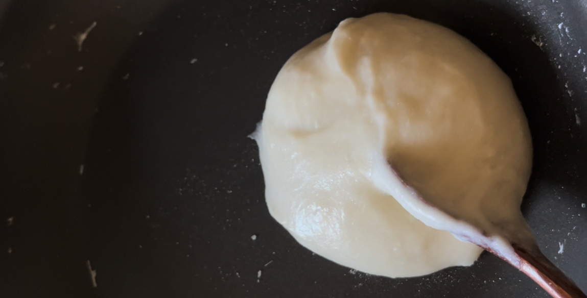 우유까지 부어주고 나면 덩어리가 생기지 않게 최대한 잘 섞어주세요. 아직 가스불은 켜지 않습니다. 영상에서는 한 5분 만에 뚝딱 찹쌀떡을 만들지만 덩어리가 생기지 않게 섞는 게 꽤 오래 걸려요. 최대한 뒤적뒤적 섞어줍니다. 그래도 완벽하지 않아도 괜찮아요.