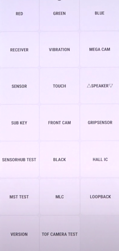 위 화면 왼쪽과 같이 별샵0별샵( *#0*#)을 입력하면 오른쪽 화면으로 들어가게 됩니다. 맨위부터 Red, Green, Blue, Reciever, Vibration, Megacam, Sensor, Touch, Speaker, Sub Key, Front Cam, Grpsensor, Sensorhub Test, Black, Hall IC, MST Test, MLC, Loopback, Version, TOF Camera Test 등의 메뉴가 보입니다. 갤럭시의 버전에 따라 S-pen 메뉴가 있는 것도 있고 순서가 다를 수도 있습니다. 메뉴가 조금씩 다를 수도 있는 점 참고해주세요. 이중에서 중요한 테스트 몇가지만 살펴보면 다음과 같습니다.