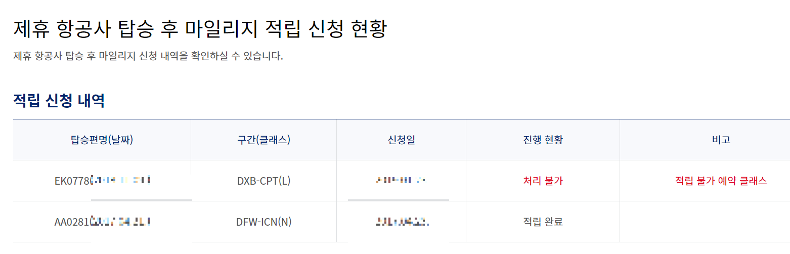 티켓실물을 사진찍어 증빙자료를 송부해야할때도 있고, 크게 이상없다면 며칠 후 누락된 마일리지가 적립된 것을 확인할 수 있는데요. 마일리지 적립이 가능한 예약 등급이 아닌 경우, 대한항공/제휴항공사 탑승의 경우에도 마일리지 적립이 되지 않습니다. (그 경우 아래와 같은 문구가 떠요. 저는 이번에 적립을 못하였어요. 쩝.)