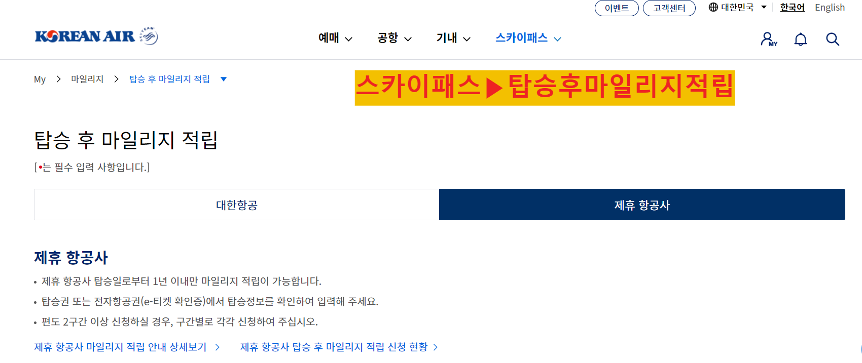 ▽대한항공 마일리지 적립 페이지 바로가기▽