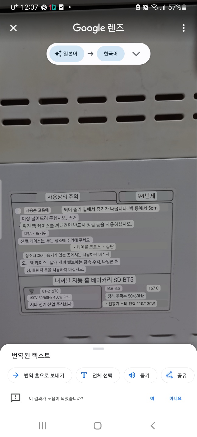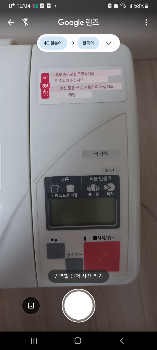 구글렌즈 덕분에 제빵기에 쓰인 일본어 내용을 (대충이나마) 다~ 파악하고, 인터넷으로 매뉴얼도 찾아내서, 무사히 사용할 수 있었습니다. 정말 많이 신기하고 요긴했던 구글 렌즈 스캔 번역! 일본어 뿐만 아니라, 외국어 무엇이든 번역이 필요할 때 신통방통하게 사용할 수 있을 것 같아요. (해외 체류 중 메뉴판 스캔이라든가..)
