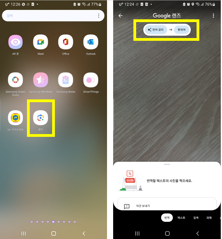 '구글 렌즈' 앱이 없다면, 폰에 설치해줍니다. 사용법은 너무나 직관적이라, 누구나 어렵지 않게 바로 번역 스캔을 시작할 수 있어요. 앱 실행 후, 아래쪽 '번역'을 눌러주면, 알아서 '언어 감지'부터 시작되기에, 구글 렌즈 앱을 실행한 채로 번역이 필요한 곳에 카메라를 갖다대면(!) 됩니다.