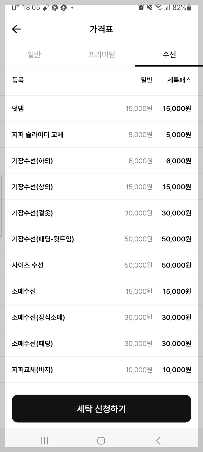 기본적으로 세탁앱이기 때문인지, 수선만 신청할 순 없고 맞춤 세탁이 기본으로 병행되어야 하는데요. 저는 어차피 트렌치코트를 세탁소 드라이도 함께 맡길 계획이었기 때문에, 수선/세탁 함께 신청했습니다.