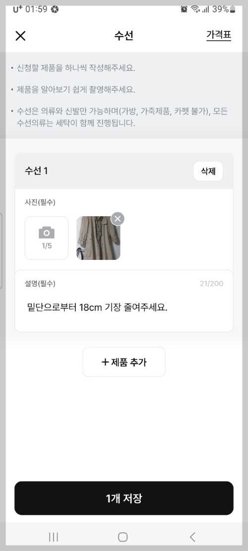 수선이 필요한 옷의 사진을 첨부하고, 신청 내용을 정확하게 "밑단으로부터 18cm 기장 줄여주세요"라고 입력했어요.