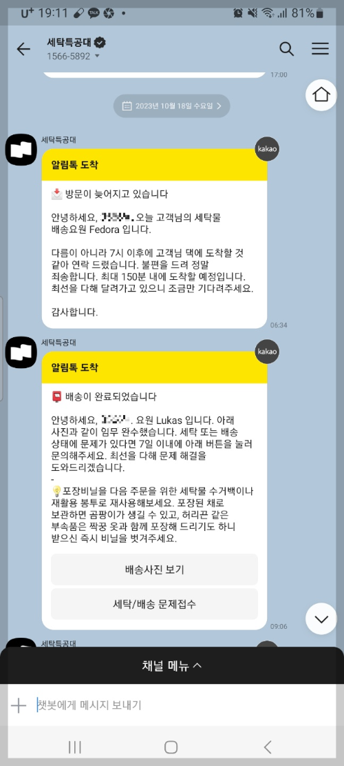 집앞에 세탁물을 내놓은 다음날 새벽, 세탁물이 수거되었다는 알림 카톡을 받았고, 몇시간 후 세탁물 검수가 끝난 요금 세부 내역도 받아 직접 앱의 가격표와 대조해 확인할 수 있었습니다.