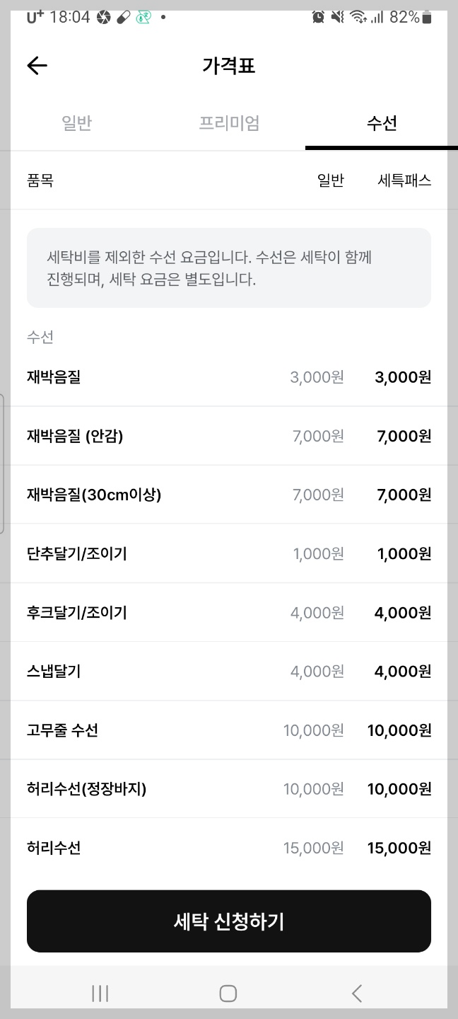 세탁특공대 앱 첫 화면은 아래 사진처럼 세탁신청/가격표/이용방법 등, 직관적으로 버튼이 설정되어 있어, 진행하는 것이 어렵지 않았습니다. '세탁 가격표'는 크린토피아에서도 본 적이 있었지만, '수선 가격표'는 처음 보는 거라 참 신기했어요. '단추 달기'부터 '기장 수선' 등, 매우 세분화되어있더라고요.